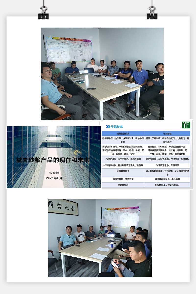 7月14日下午銷售部每周例會結束后,又請實驗室朱主任為銷售部進行產品知識培訓。此次朱主任特意準備了35頁的精美PPT,培訓主題是“益夫砂漿產品的現(xiàn)在和未來”,內容包括對公司現(xiàn)有產品的成分、性能、施工工藝、產品之間優(yōu)劣勢對比、現(xiàn)場常見產品問題的展示并給出解決方案、對市面上新型產品進行分析、對公司未來的產品發(fā)展指出方向。PPT內容附上現(xiàn)場圖片和施工視頻,圖文結合,直觀易懂。從2020年起,砂漿的規(guī)格型號就發(fā)生了改變,朱主任在培訓時針對型號的變化做出解釋,這方便業(yè)務員日后與工地進行說明。培訓結束后,大家熱烈鼓掌,對朱主任細致全面的培訓表示感謝,并表示此類培訓以后能夠多多開展。