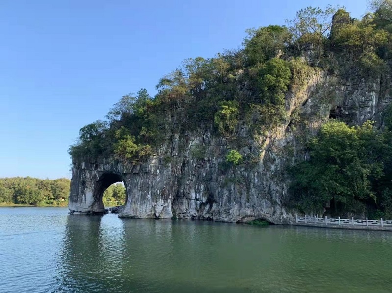 下午,抵達桂林市區(qū),游覽桂林城微象鼻山,其山酷似一頭駐足漓江邊臨流飲水的大象,栩栩如生,清碧的江水從洞中穿鼻而過,洞影倒映江面,構成“水底有明月,水上明月浮”的奇觀。